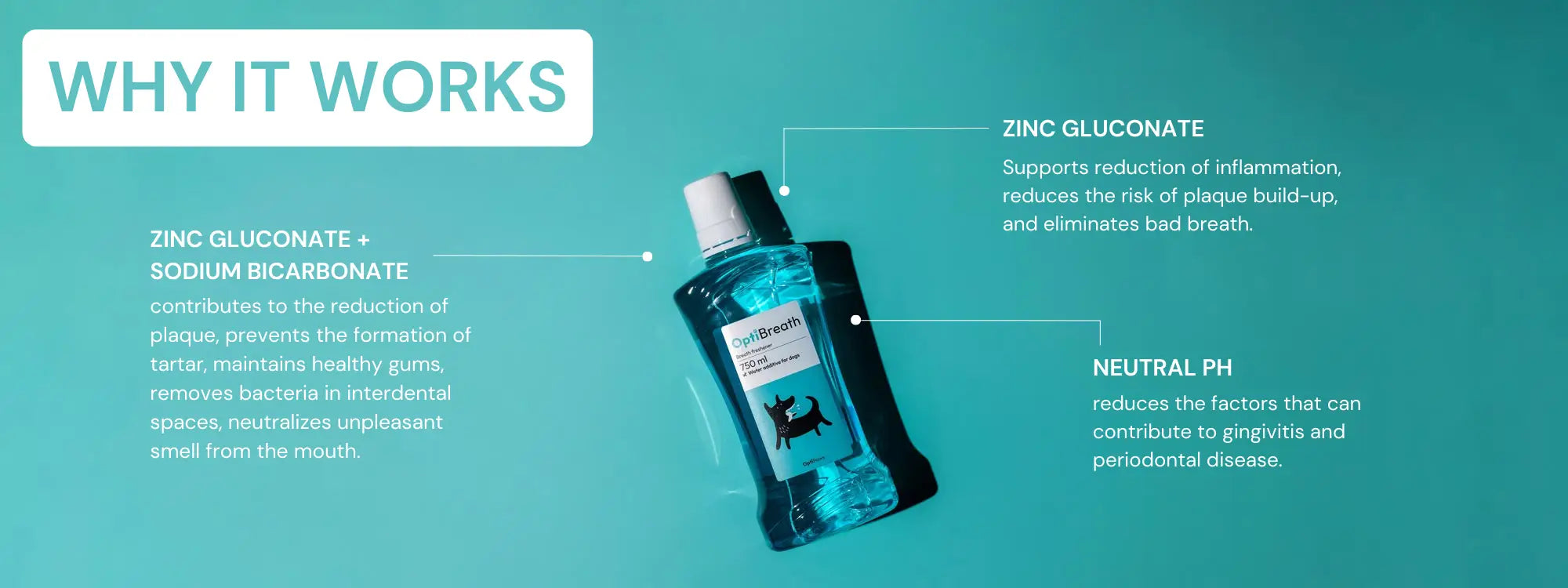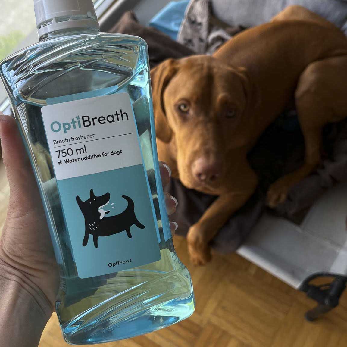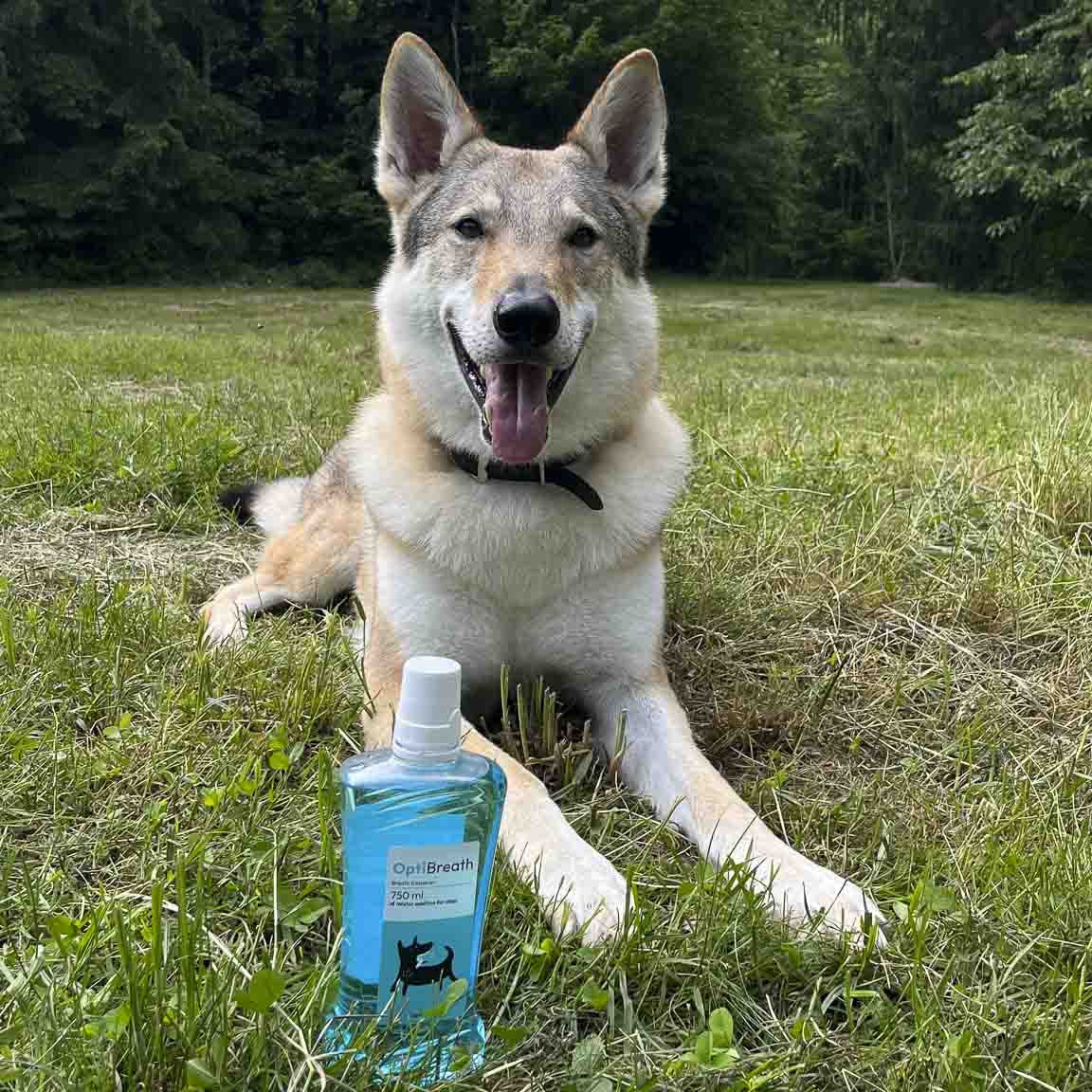 OptiBreath is a water additive for dogs, perfect to maintain their daily oral hygiene.