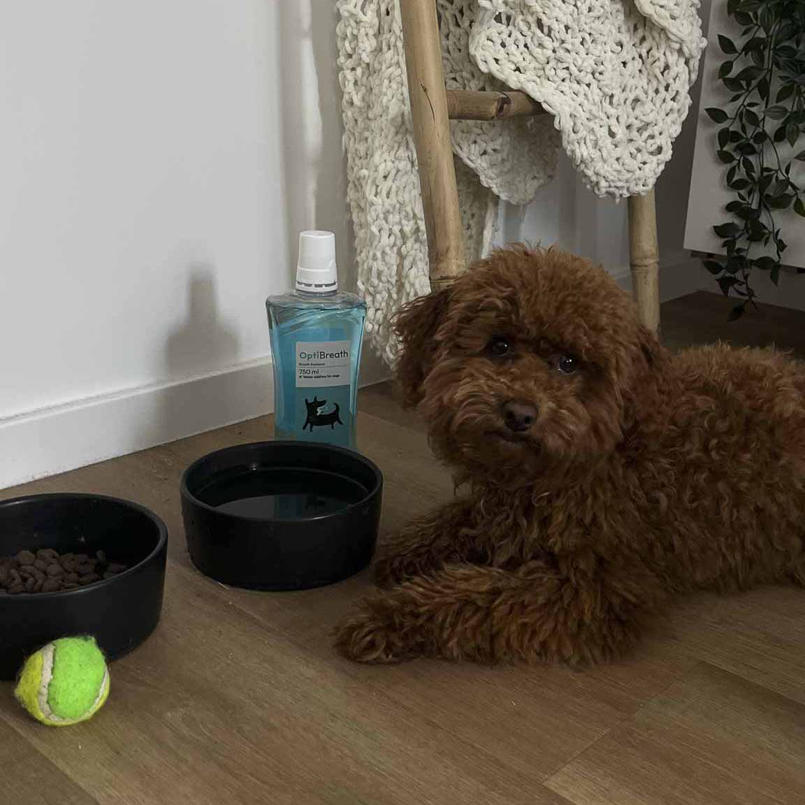 Mix 1 cap of OptiBreath with 1 L of water. Don’t forget to use Optibreath everytime you add or change your dog’s water.